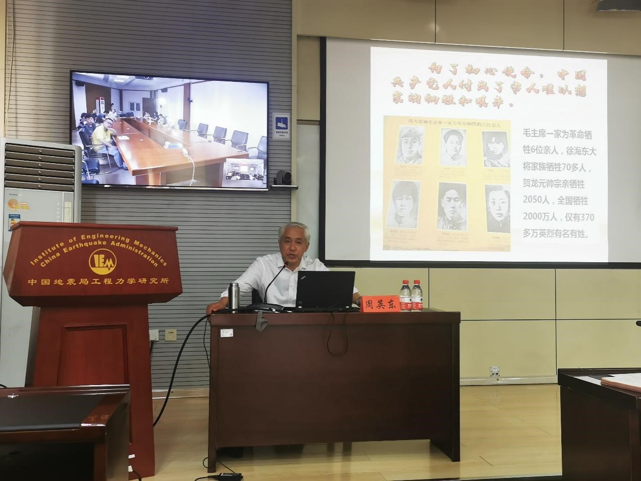 周教授首先為大家詳細解讀了“七一”講話的精髓,把講話內容分為四個部分講解——“莊嚴宣告全面建成小康社會振奮人心”“實現中華民族偉大復興的主題貫穿百年”“首次提及建黨精神”“九個‘必須’指引未來”。其中著重講解了建黨精神要從理論優勢、政治優勢、精神優勢和道德優勢四個方面理解,九個“必須”是中國共產黨領導力量、依靠力量、思想引領、事業保障、安全保證、干事原則和自身要求等方面的綜合體現。接下來周教授又從專業角度用大量感人的事例圍繞共產黨人堅守初心使命“從哪得”“為什么守”“怎么守”三個方面談了體會,重申了全體共產黨員要牢記初心使命,堅定理想信念,踐行黨的宗旨,永遠保持同人民群眾的血肉聯系,始終同人民風雨同舟,為實現人民對美好生活的向往不懈努力!