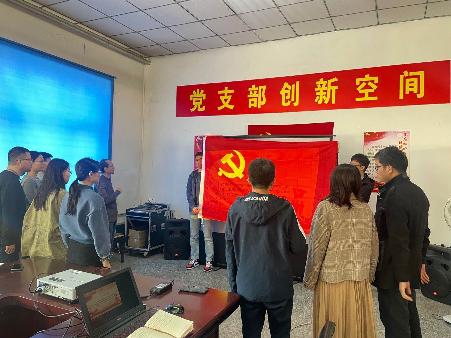 第四項:重溫入黨誓詞。由黨支部書記領(lǐng)誓,支部全體黨員在黨旗下重溫入黨誓詞。