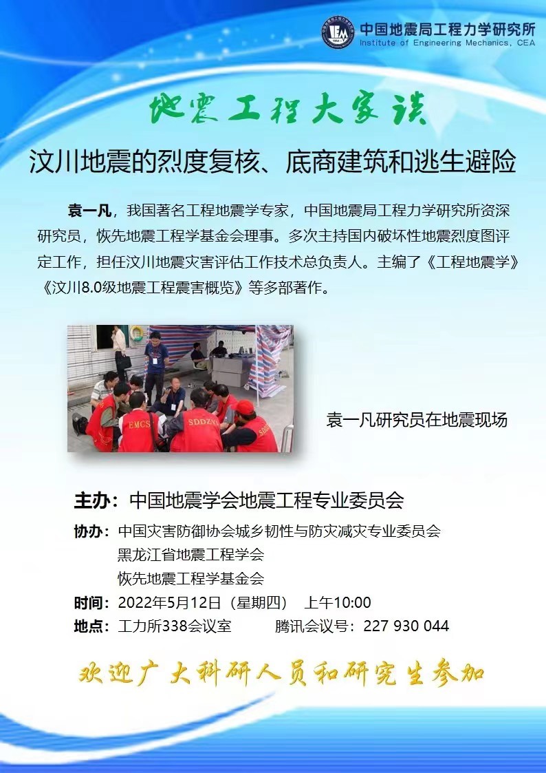 主題講座。5月12日,為提升全社會防災(zāi)減災(zāi)能力,我所舉辦了“地震工程大家談”主題講座,邀請了我所袁一凡研究員在線上作了題為《汶川地震的烈度復(fù)核、底商建筑和逃生避險》報告。