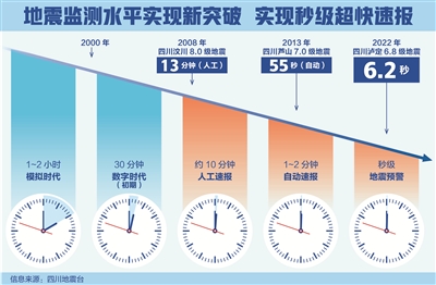 近年來,我國地震預警信息產出速度不斷提升,從約10分鐘的人工速報到1至2分鐘的自動速報,再到秒級的地震預警,為抗震救災提供了強大科技助力。(制圖:張寒)