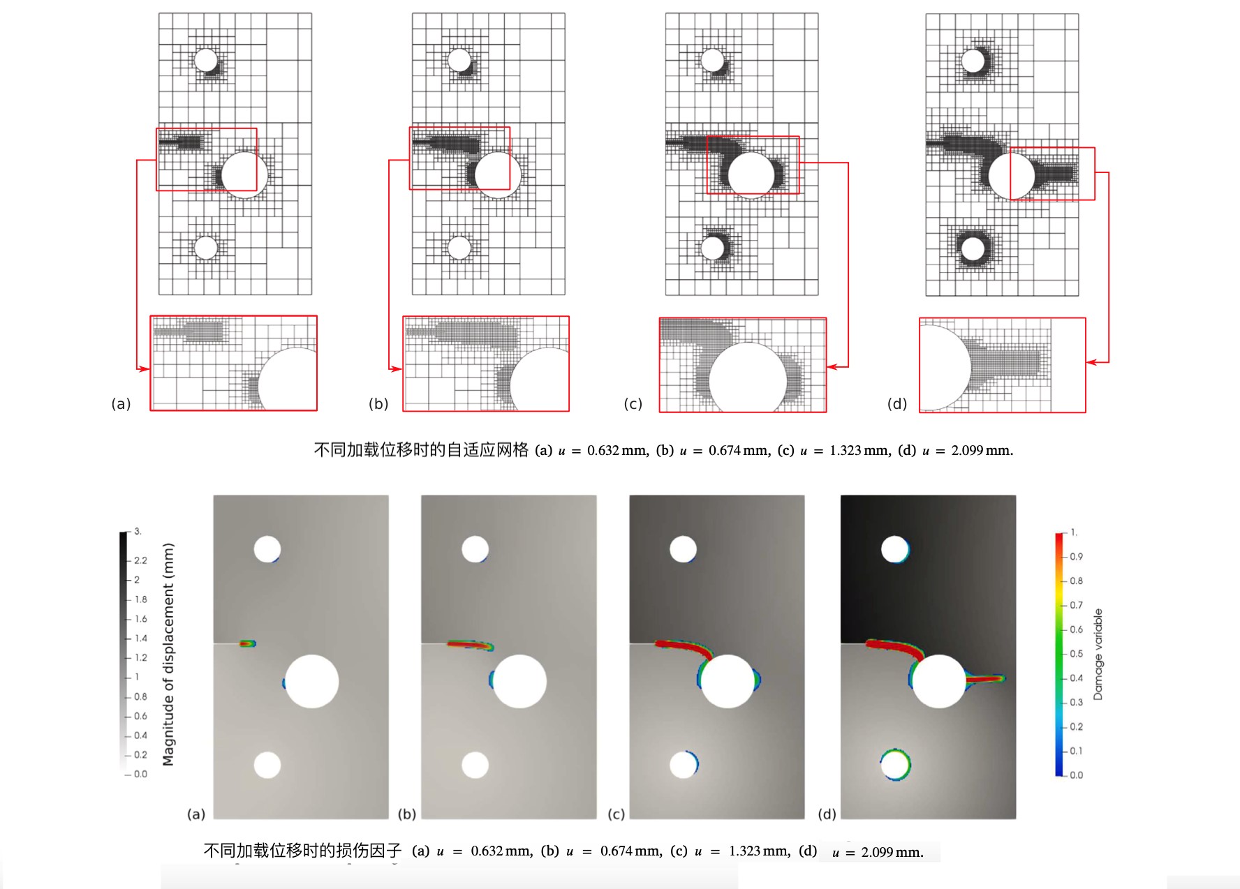 提出網(wǎng)格剖分和荷載步長自適應(yīng)的擬脆性材料損傷演化算法,提高網(wǎng)格局部細(xì)化效率,減少非線性方程計算總步數(shù)。