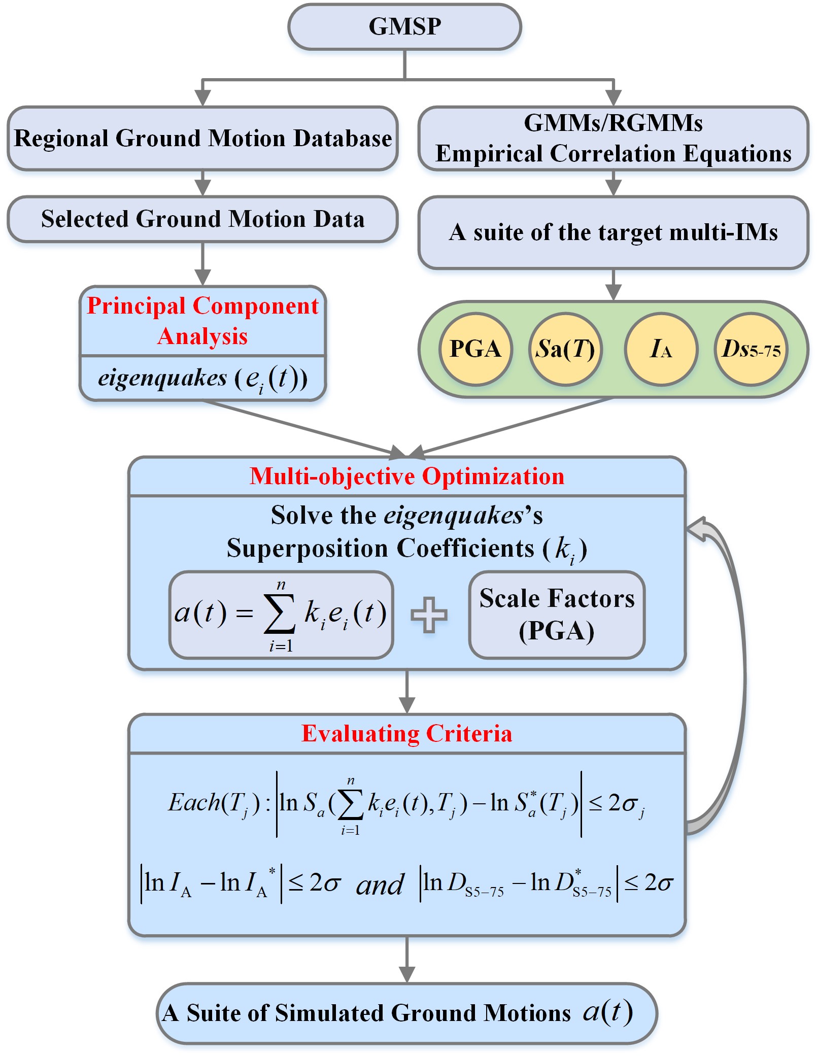 本研究構建了一套基于特征提取匹配多強度指標的地震動模擬程序(GMSP,見圖1)。該地震動模擬程序的目的是在設定地震情景下為單一場點生成一組充分考慮地震動幅值、頻譜、持時和累積能量的加速度時程。多個標量地震動強度指標被選取建立了目標矢量強度指標([IA, DS5-75, PGA, SA(T)]),該矢量強度指標被用于在模擬過程中控制擬合優度。GMSP通過將一組實際地震動記錄經主成分分析方法(PCA)特征提取后得到一組標準的正交基向量,即eigenquakes。采用多目標遺傳算法結合約束條件進行迭代尋優,求解每個eigenquake對應的線性疊加系數。最終,在時域上完成縮放疊加得到模擬地震動記錄。
