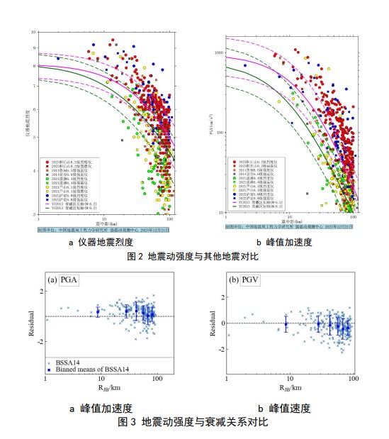 對比分析了此次地震的地震動參數(儀器地震烈度、峰值加速度PGA和峰值速度PGV)與我國2015版地震動參數區劃圖地震動衰減關系的估計值、2022年四川瀘定6.8級地震、2021年云南漾濞6.4級地震的地震動參數差別(見圖2)。整體上,儀器地震烈度和峰值加速度明顯高于2015版地震動參數區劃圖中地震動衰減關系的估計值;此次地震的地震動與震級更大的瀘定6.8級地震的地震動較為接近,明顯大于漾濞6.4級地震的地震動。對比地震動參數與美國NGA-West 2 衰減關系(見圖3),峰值加速度高于NGA-West 2衰減關系中位值,峰值速度與衰減關系中位值較為接近,表明此次地震地震動的高頻能量顯著。
