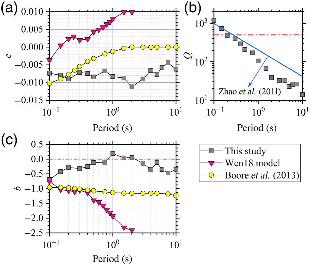在數據質量篩查和數據處理后,選取242組高質量的地震動觀測記錄,首先利用垂直分量的擬加速度反應譜(PSA)分析了唐山地震帶的地震動距離衰減(見圖1),發現該地區的非彈性衰減很強,但幾何擴展較弱(見圖2),采用不同的幾何擴散表達形式來描述幾何擴展,發現三段線性幾何擴散模型可以很好的表示唐山地區的地震動距離衰減,在中等距離(60-100km)處并未出現幾何擴展衰減。PGA和PGV的空間分布出現高烈度異常區域(寧河-寶坻地區、北京南部等),根據寧河-寶坻地區和北京南部的地震動標準譜比的寬頻帶、高幅值特征及體波后顯著的長周期面波(見圖3),寧河-寶坻地區出現非常顯著的2-5s的盆地誘發面波,說明這些地區存在顯著的盆地放大效應,盆地放大效應造成了此次地震中的高烈度異常,這也可能是1976年唐山大地震中高強度異常區的原因之一。