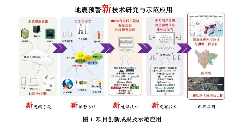 項(xiàng)目緊緊圍繞國(guó)家重大建設(shè)項(xiàng)目“國(guó)家地震烈度速報(bào)與預(yù)警工程”實(shí)施中亟待解決的關(guān)鍵科技問(wèn)題,針對(duì)確定地震預(yù)警參數(shù)的“快和準(zhǔn)”問(wèn)題和地震預(yù)警系統(tǒng)建設(shè)的技術(shù)需求,按照“理論研究—技術(shù)研發(fā)—系統(tǒng)研制—示范應(yīng)用”的一體化實(shí)施路線,基于人工智能、大數(shù)據(jù)分析等先進(jìn)新興技術(shù),通過(guò)3年多的科研攻關(guān),實(shí)現(xiàn)了“新觀測(cè)手段、新預(yù)警方法、新處理技術(shù)、新發(fā)布技術(shù)”的“四新”創(chuàng)新點(diǎn),并在四川、云南、京津冀以及川藏鐵路成功進(jìn)行了示范應(yīng)用。