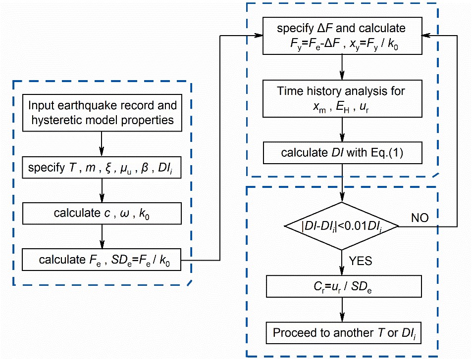2)基于強度和基于延性的彈塑性位移本質上僅考慮位移響應對結構破壞的影響,不能同時考慮延性和耗能對結構破壞的耦合影響。本研究基于修正的Park-Ang雙參數損傷模型的損傷指數DI,建立了單自由度體系基于損傷的殘余位移比Cr譜(殘余位移與譜位移之比),流程如圖1所示。