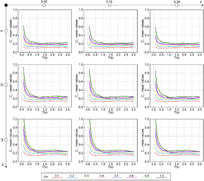 3)研究結構周期、損傷指數DI、極限延性系數μu、耗能系數β,滯回模型以及后屈服剛度α等因素對基于損傷的Cr譜的影響(圖2),給出基于損傷的Cr譜預測方程(圖3)。