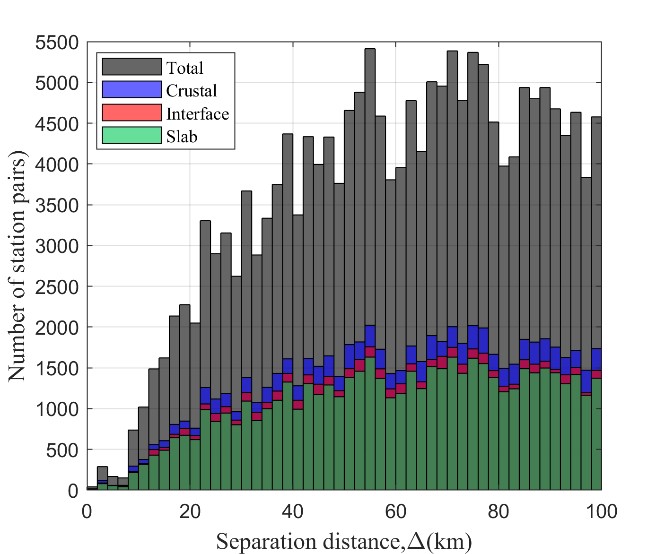 圖2 不同分離距離內(nèi)的臺站對數(shù)及計算的相應的空間相關性值