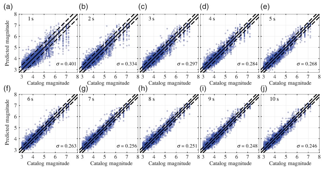 圖2 P波到達后1-10秒,基于SVM-M模型的單臺震級估計結(jié)果