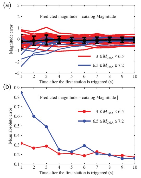 圖3 首臺觸發(fā)后,震級估計誤差與隨時間的演化