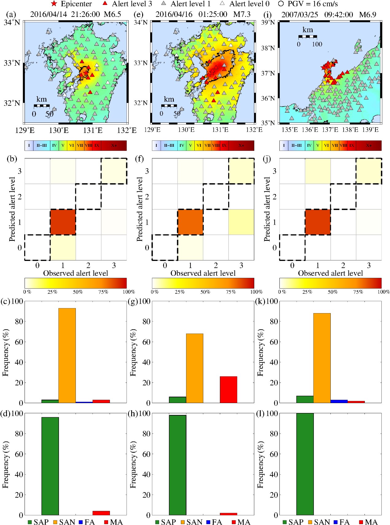 1)利用日本K-net強(qiáng)震觀測(cè)加速度數(shù)據(jù)建立訓(xùn)練、測(cè)試、驗(yàn)證數(shù)據(jù)集,構(gòu)建了基于多特征輸入和機(jī)器學(xué)習(xí)支持向量機(jī)(SVM)的震級(jí)估計(jì)和峰值速度(PGV)預(yù)測(cè)方程。這兩種預(yù)測(cè)方程分別稱為估計(jì)震級(jí)的SVM-M模型和預(yù)測(cè)PGV的SVM-PGV模型。設(shè)置預(yù)測(cè)震級(jí)閾值和PGV閾值分別為M=5.7和PGV=9.12 cm/s,當(dāng)預(yù)測(cè)震級(jí)或PGV值超過(guò)給定閾值時(shí),會(huì)在不同的記錄點(diǎn)發(fā)出不同的警報(bào)級(jí)別(0、1、2、3)。警報(bào)級(jí)別3表示預(yù)測(cè)的震級(jí)和預(yù)測(cè)的PGV都超過(guò)給定的閾值,并且該記錄站點(diǎn)可能會(huì)受到嚴(yán)重破壞。(圖1)