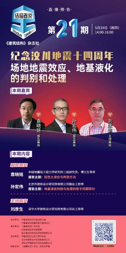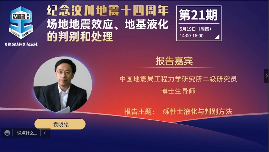 2022年5月19日,為紀(jì)念汶川地震十四周年、針對(duì)工程中常見的液化問題,我所袁曉銘研究員受“結(jié)構(gòu)者說”直播平臺(tái)邀請(qǐng)作了“礫性土液化與判別方法”的專題講座,取得良好效果,收看人數(shù)達(dá)2.07萬(wàn)。