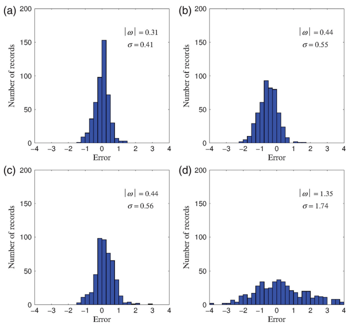 圖1 P波到達(dá)后3秒時(shí),(a)TLSVM-M模型、(b)SVM-M模型、(c)Pd方法和(d)?c方法的震級(jí)估計(jì)誤差分布