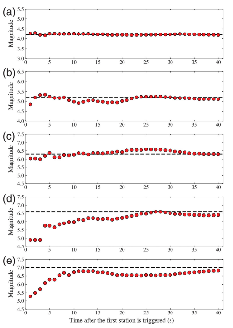 圖3 首臺(tái)觸發(fā)后,五次地震事件的震級(jí)估計(jì)隨時(shí)間的演化
