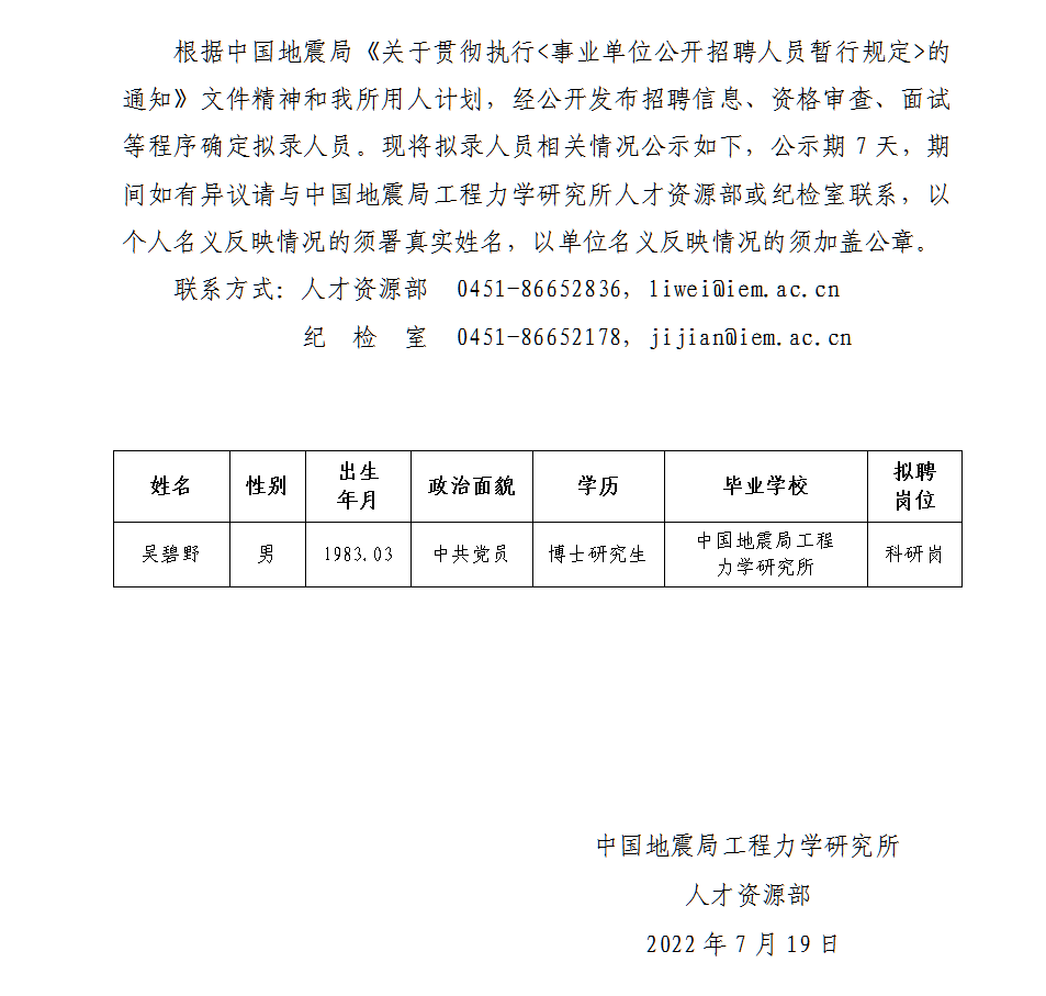 中國(guó)地震局工程力學(xué)研究所2022年擬錄用人員公示(四)