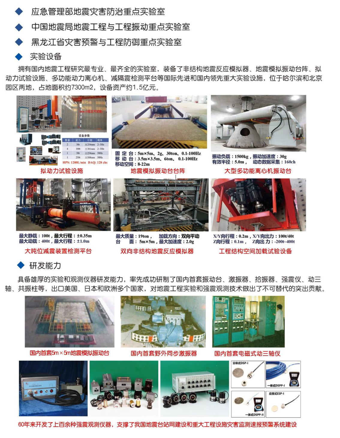 研究所科技隊(duì)伍實(shí)力雄厚,現(xiàn)有院士5人(含兼職3人)、正研級(jí)專家34人(含二級(jí)崗研究員9人)、高級(jí)職稱專家100余人。現(xiàn)有中國地震局科技創(chuàng)新團(tuán)隊(duì)8個(gè)、黑龍江省“頭雁”團(tuán)隊(duì)1個(gè)。主攻研究方向包括:強(qiáng)震動(dòng)觀測(cè)及其應(yīng)用、工程地震學(xué)、建筑工程抗震、生命線地震工程、巖土地震工程、地震災(zāi)害風(fēng)險(xiǎn)區(qū)劃與防治、地震工程試驗(yàn)技術(shù)、地震與工程振動(dòng)測(cè)量技術(shù)等。在北京東燕郊設(shè)有科技園區(qū),建有應(yīng)急管理部地震災(zāi)害防治重點(diǎn)實(shí)驗(yàn)室、中國地震局地震工程與工程振動(dòng)重點(diǎn)實(shí)驗(yàn)室、黑龍江省災(zāi)害預(yù)警與工程防御重點(diǎn)實(shí)驗(yàn)室、黑龍江省防震減災(zāi)工程技術(shù)研究中心,擁有國際先進(jìn)、國內(nèi)領(lǐng)先的地震工程綜合試驗(yàn)系統(tǒng)。
